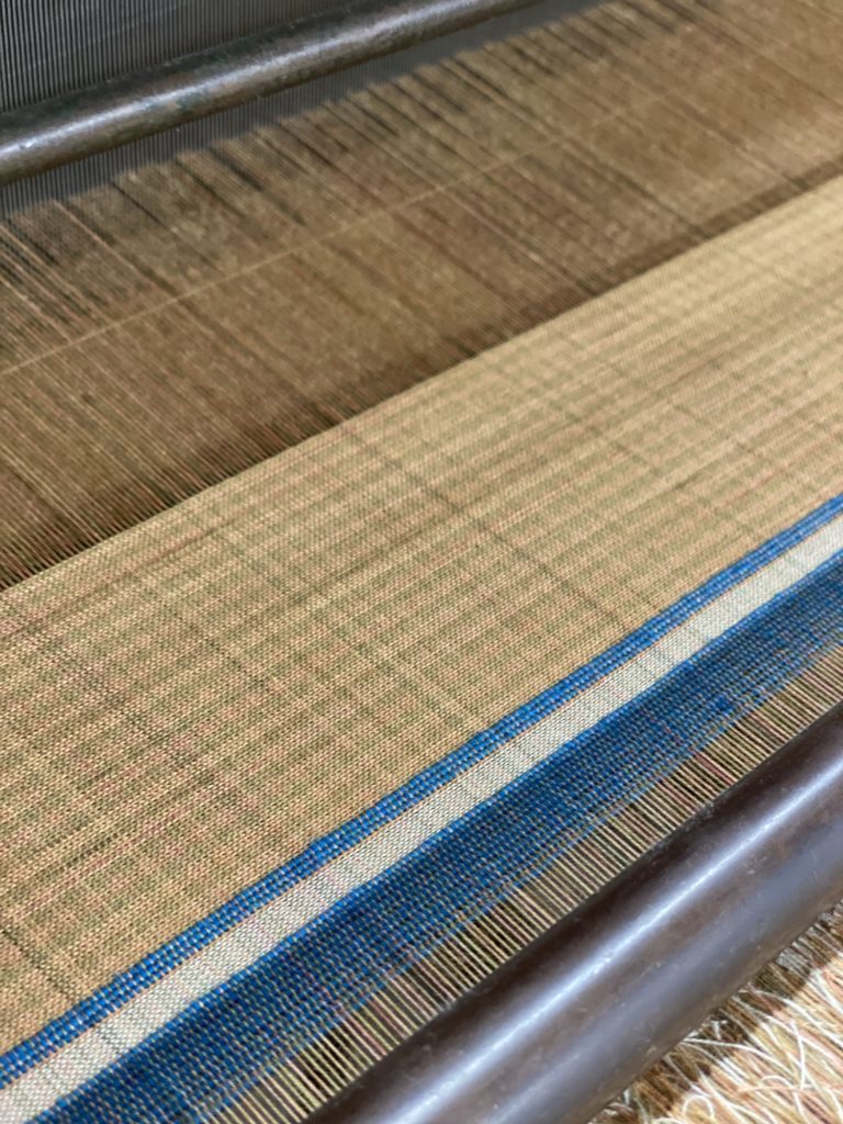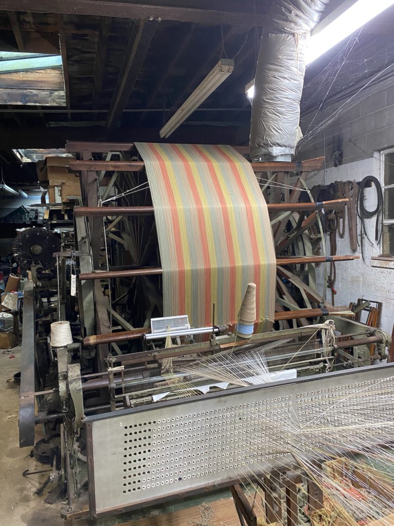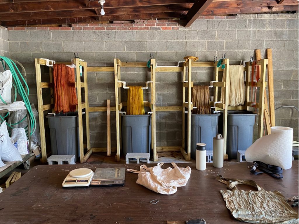 During the summer of 2021, between my first and second year of graduate school, I completed a project that included dyeing about 200lbs of cotton yarn with madder, osage orange wood, and black walnut hulls, preparing the yarn for weaving, and completing a residency at a small fabric mill where I installed the yarn on mechanical looms to be woven into fabric for apparel.